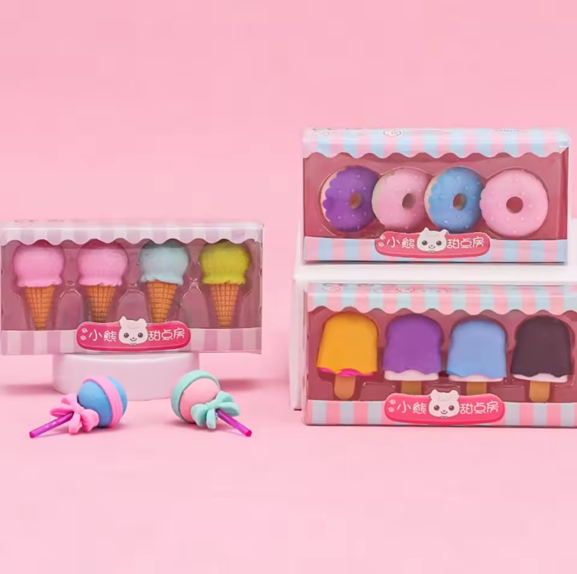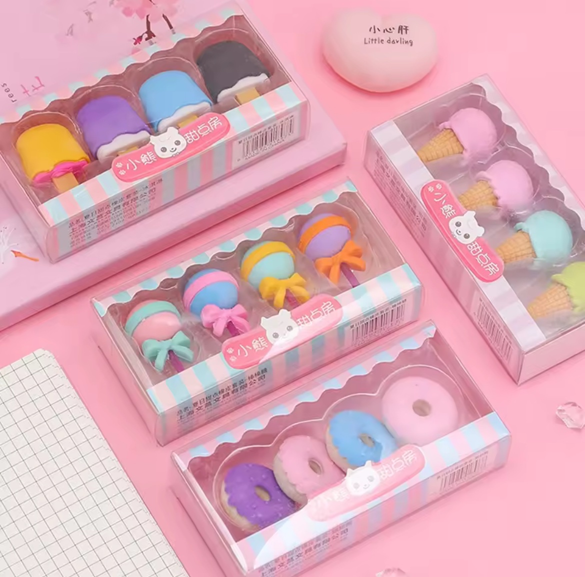 A escolha perfeita para quem adora itens fofos, criativos e cheios de estilo! Este kit de borrachas com design encantador de doces e sorvete é ideal para quem quer adicionar um toque de diversão ao material escolar. Além de serem super charmosas, essas borrachas são funcionais e eficazes, garantindo um apagamento perfeito sempre que necessário.