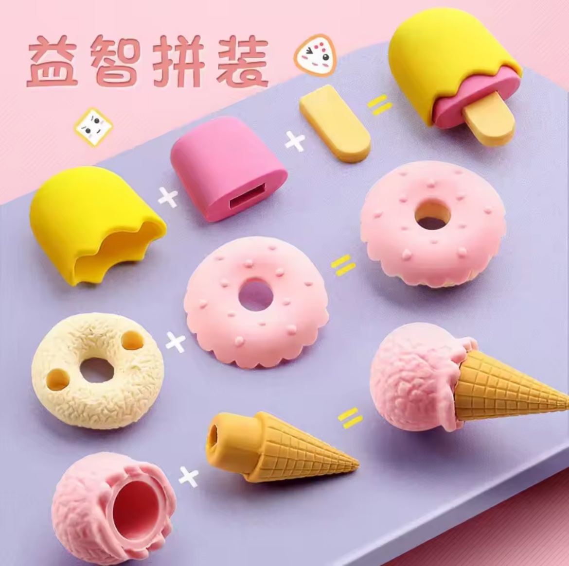 • Modelo Desmontável e Interativo: O grande diferencial dessa borracha é o seu formato desmontável, permitindo que você “desmonte” e “monte” o doce e sorvete sempre que quiser. Isso torna a experiência de usar a borracha ainda mais criativa e divertida.