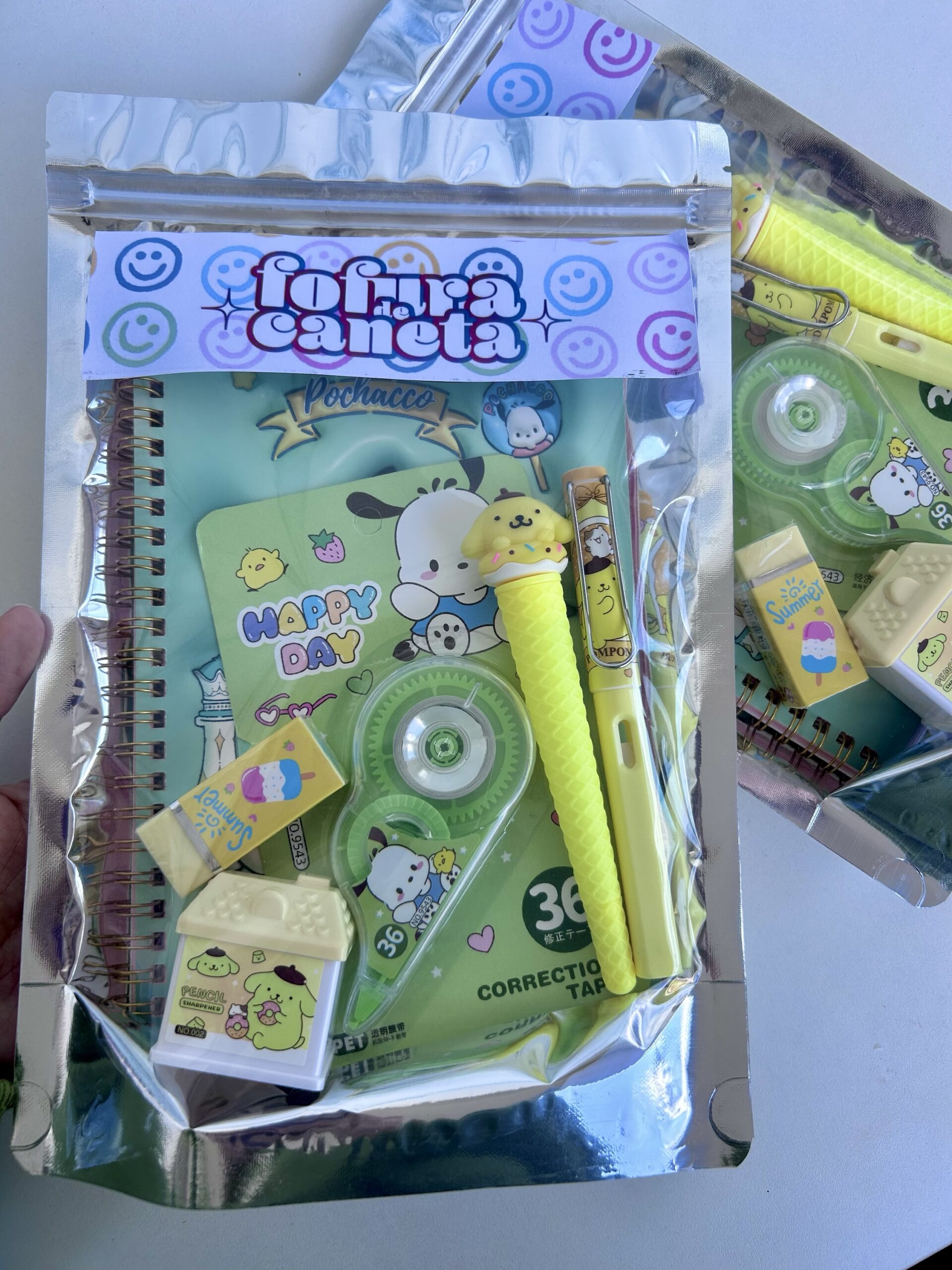 Que tal encantar com um “pacote Pochacco Pompompurin” recheado de fofuras pra encantar a criançada (e adultos também). Esse kits está super fofo e contém itens super criativos e divertidos.
