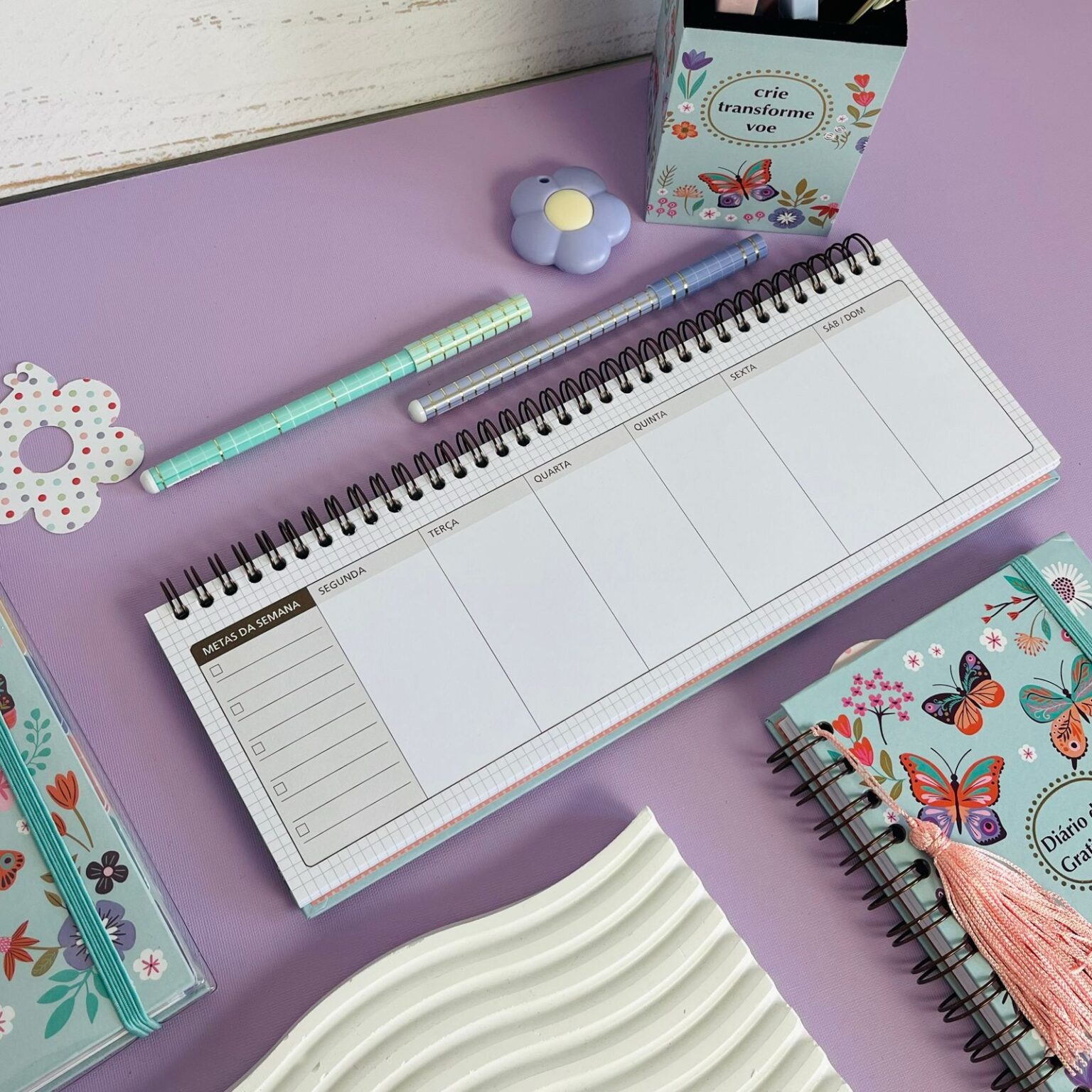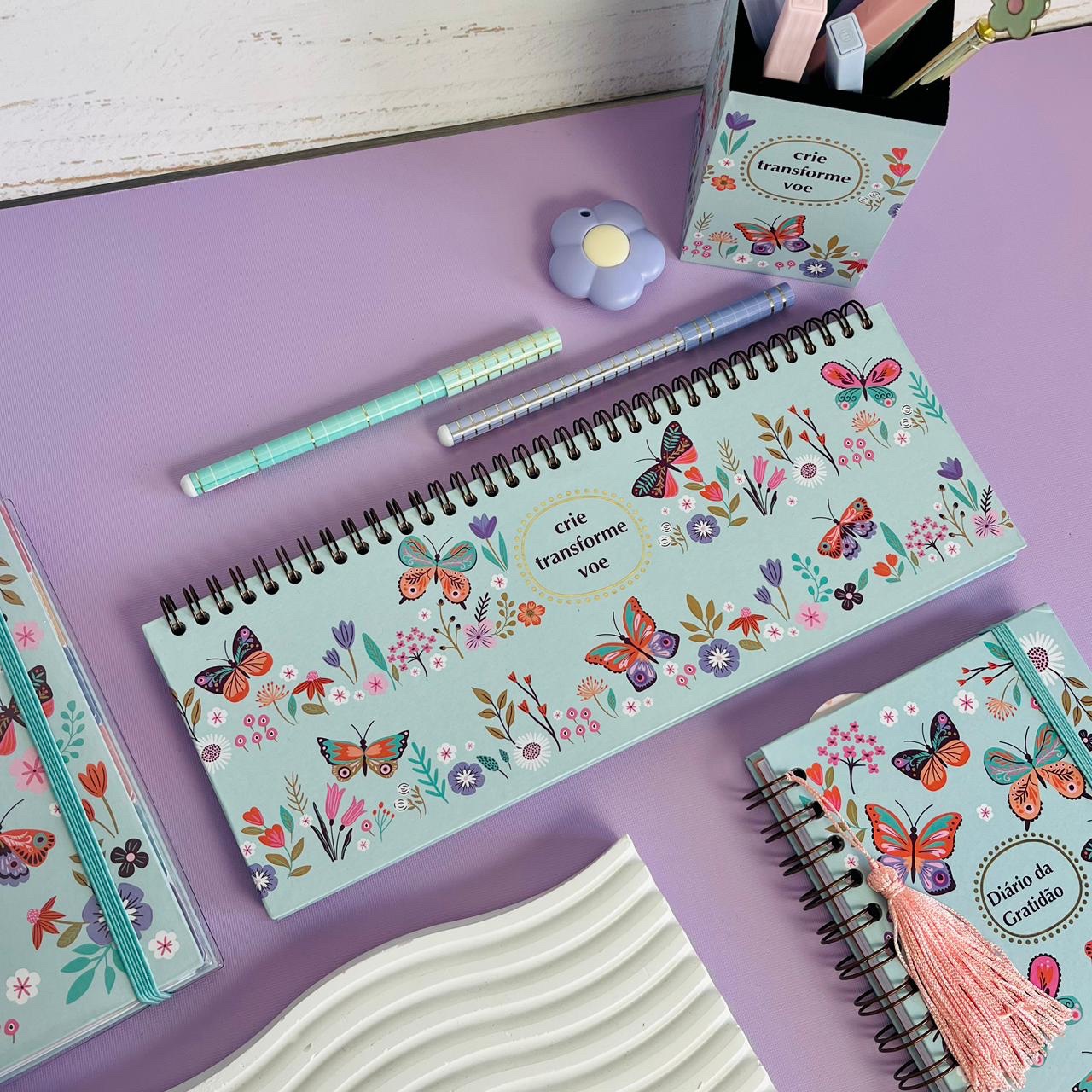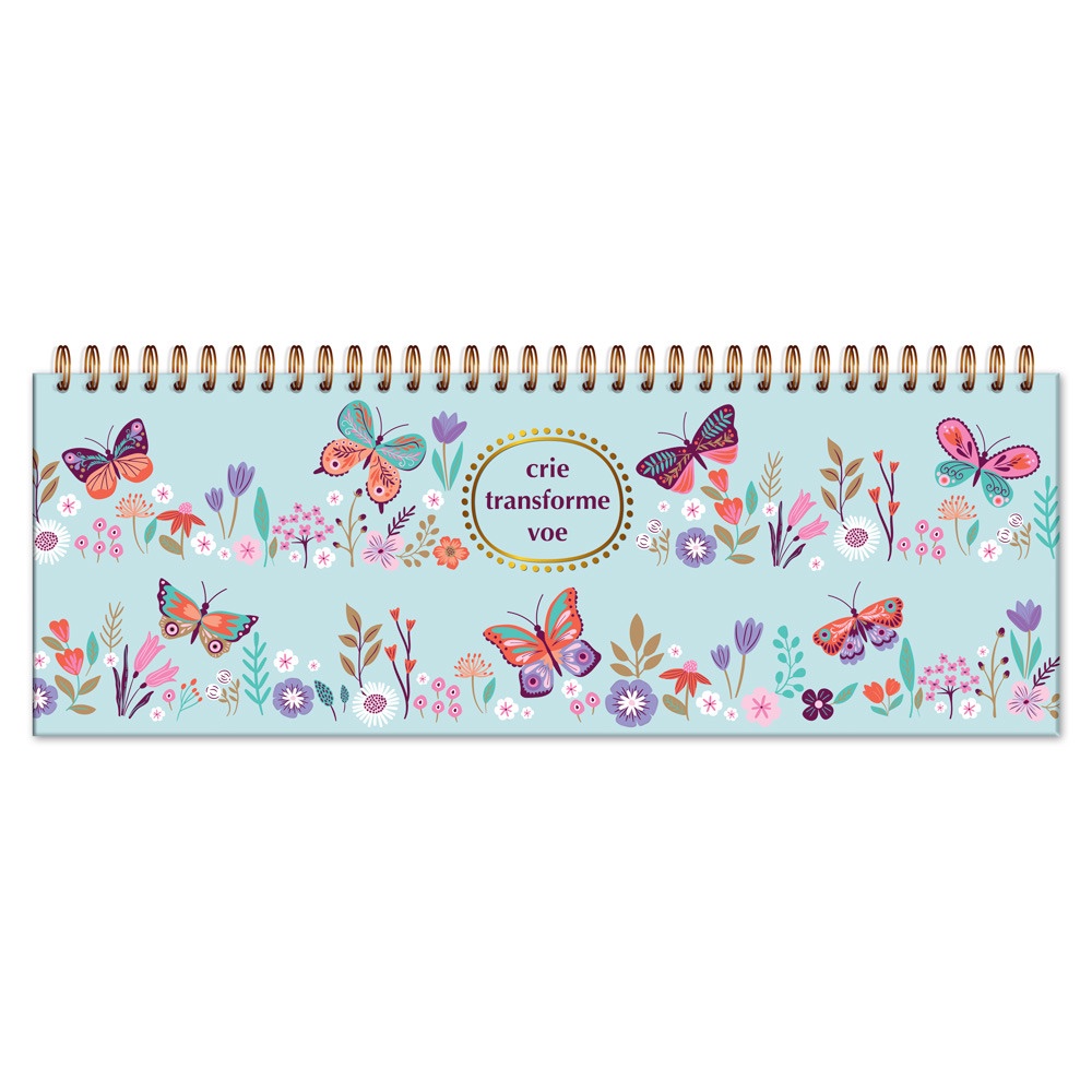 Planner com estampa de borboletas e frase inspiradora na capa. Um convite ao encantamento da rotina.