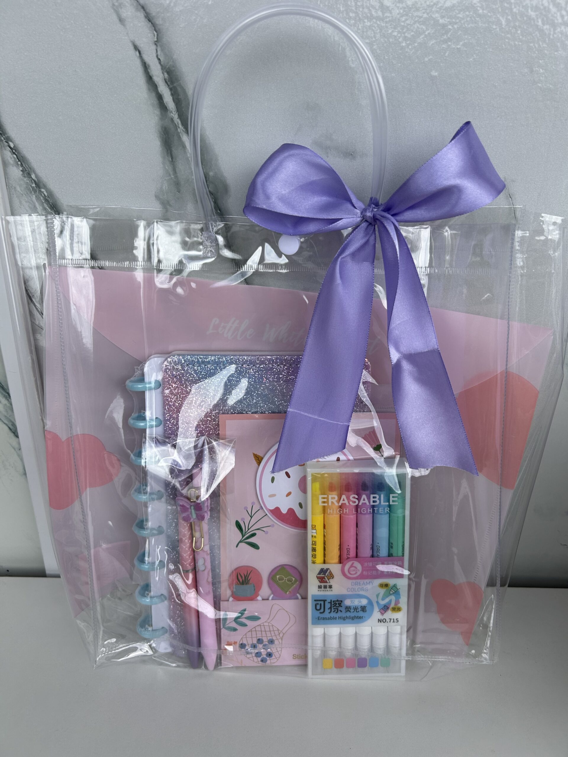 Contém: pasta, caderno disco pequeno, caneta glitter , lapiseira, bloco notas e kit marca texto apagável
