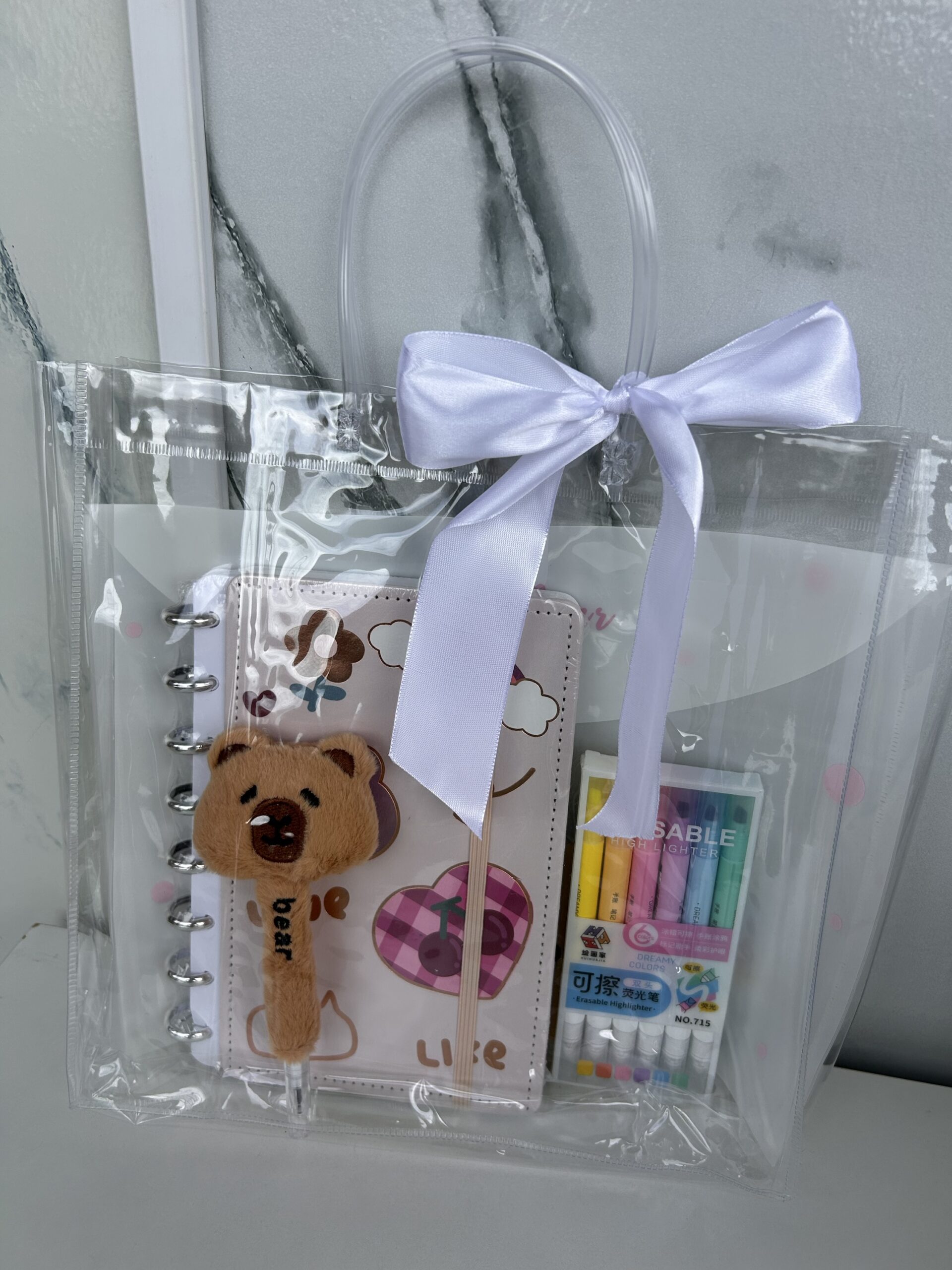 Contém: pasta, caneta pelúcia, caderno disco pequeno e kit marca texto apagável